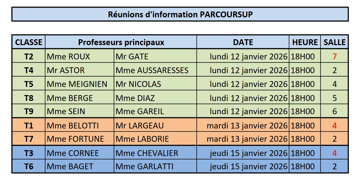 Pour mémoire, le planning des réunions d'information Parcoursup organisées à la mi-janvier - par classe - pour nos élèves de terminale et leurs parents au lycée :
